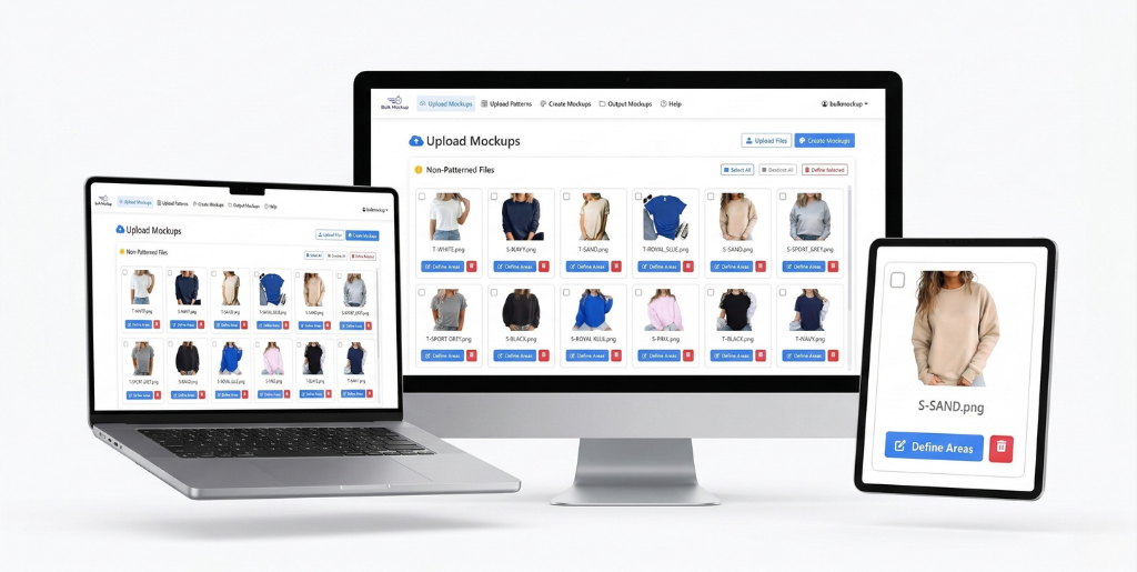Bulk Mockup Creator is a browser-based tool that automates the process of placing your designs onto product photos. Instead of doing it manually one by one in Photoshop, you define the placement area once, add all your designs, and the system generates every mockup automatically. It’s built specifically for sellers who need high-volume product image creation — such as Etsy sellers, Amazon sellers, and e-commerce stores.